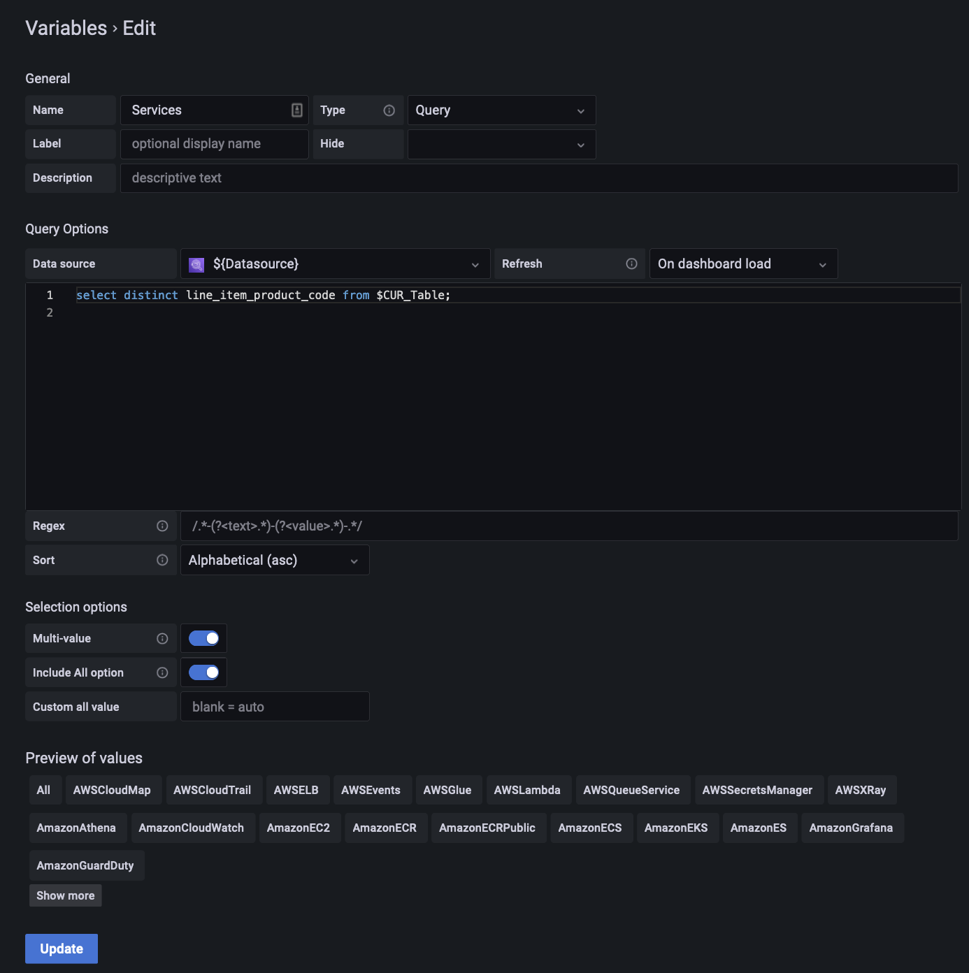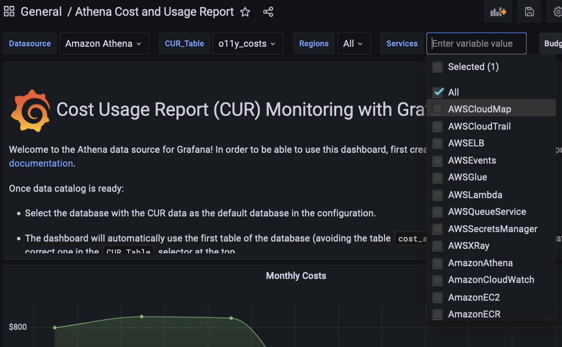 You can see in our Athena Cost & Usage Report dashboard that we use several template variables to make browsing between different data sources and services easier. For example, here you can see we use a template variable to select all services which lets us drill down into the costs for a particular service.