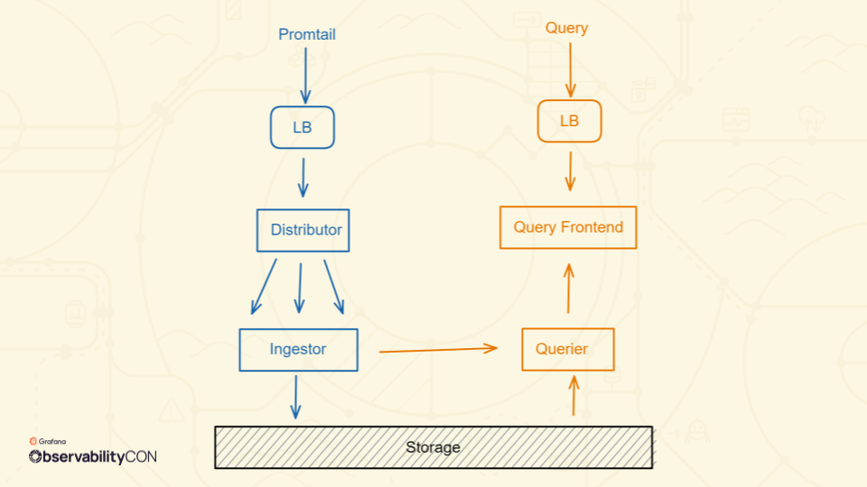 The talk then provided a more fine-tuned look at Civo’s Loki setup (below), outlining the necessary components to successfully process, store, and query logs.