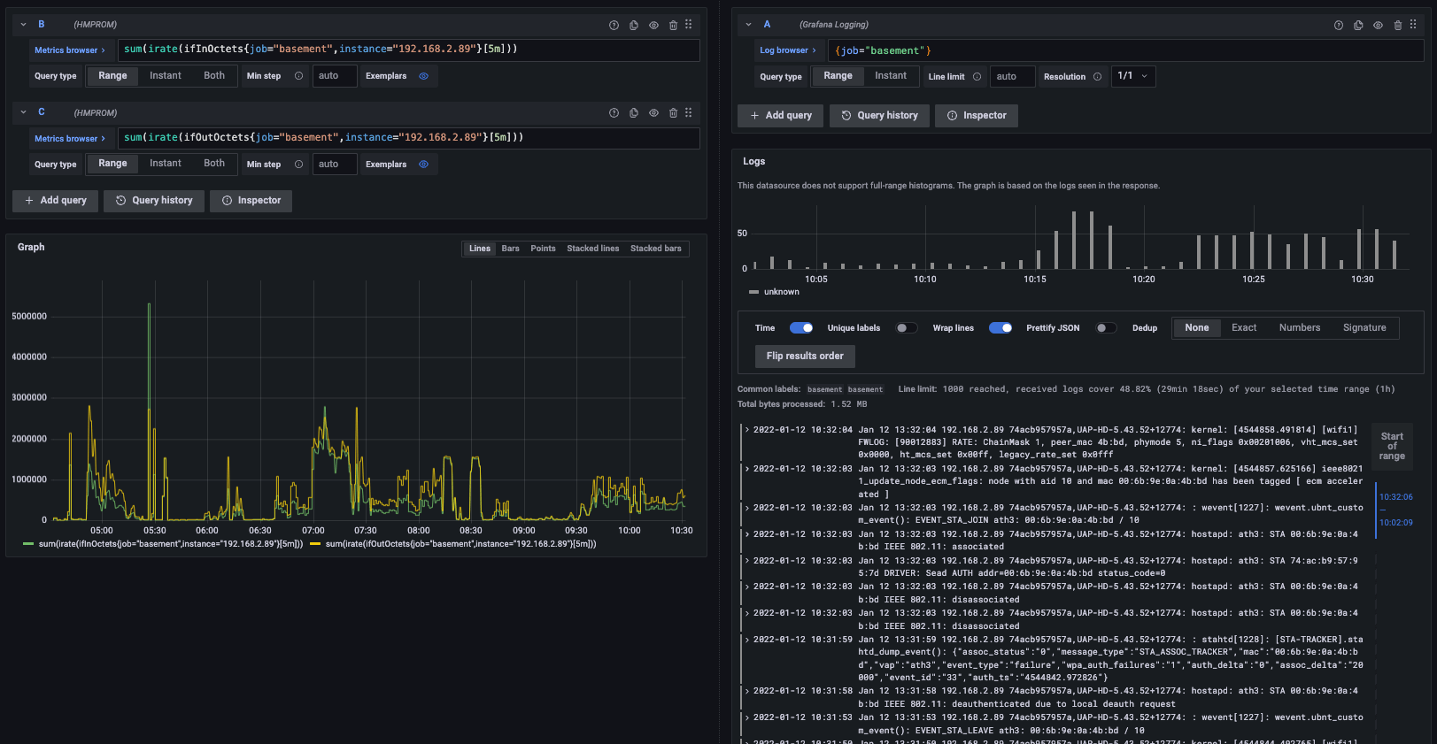 To leave you with the art of the possible, below are Grafana dashboards that show SNMP Prometheus network metrics and Syslogs that are being sent to Grafana Loki and unified in a single view as well as a side-by-side correlated view of SNMP metrics and Syslog data: