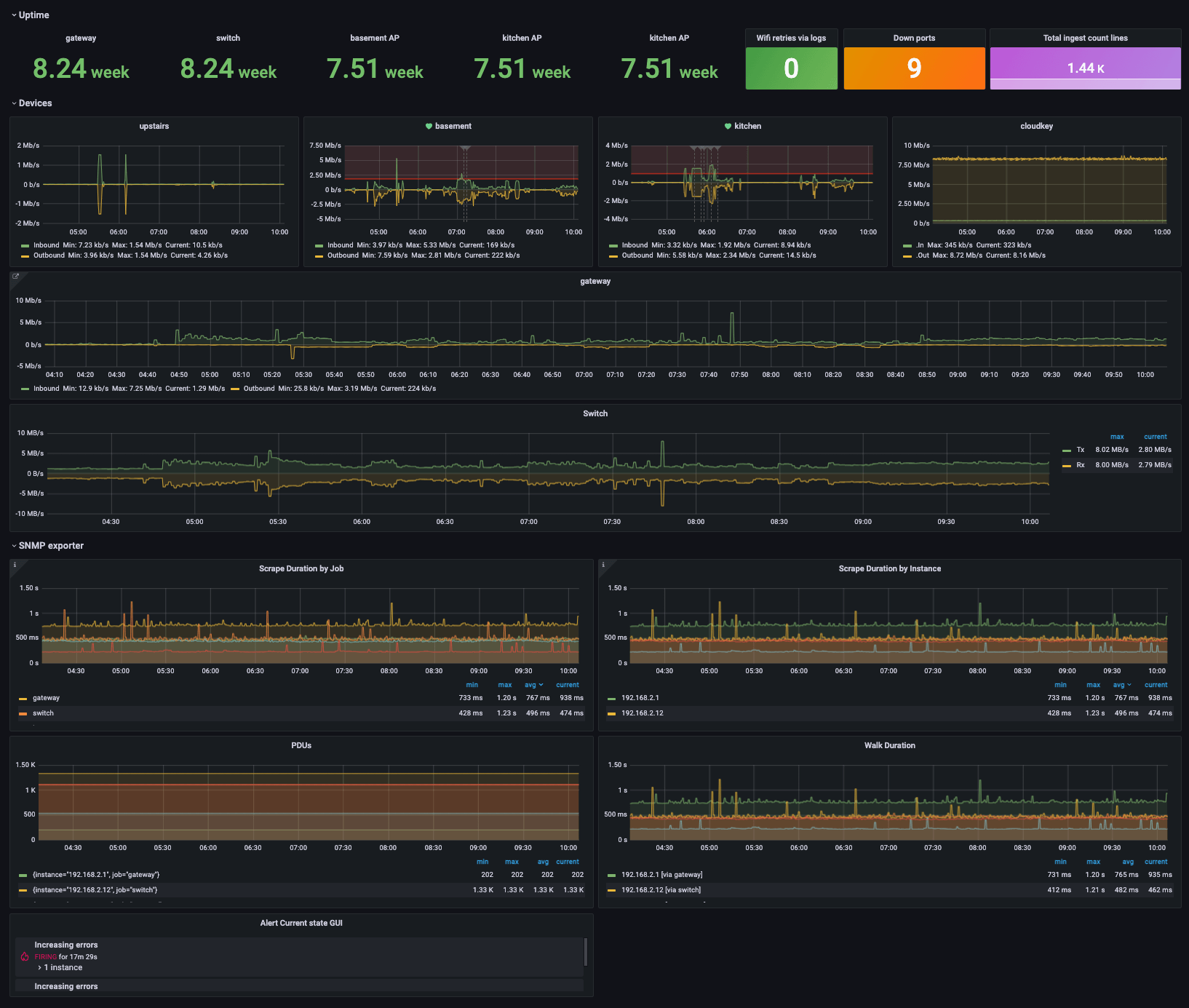 Here at Grafana Labs, we want to help facilitate the monitoring of those important network devices and provide a few simple ways to get started. Our SNMP mixin is a great baseline for monitoring network devices. A mixin is a configurable, reusable, and extensible package which bundles together Grafana dashboards and Prometheus rules and alerts.