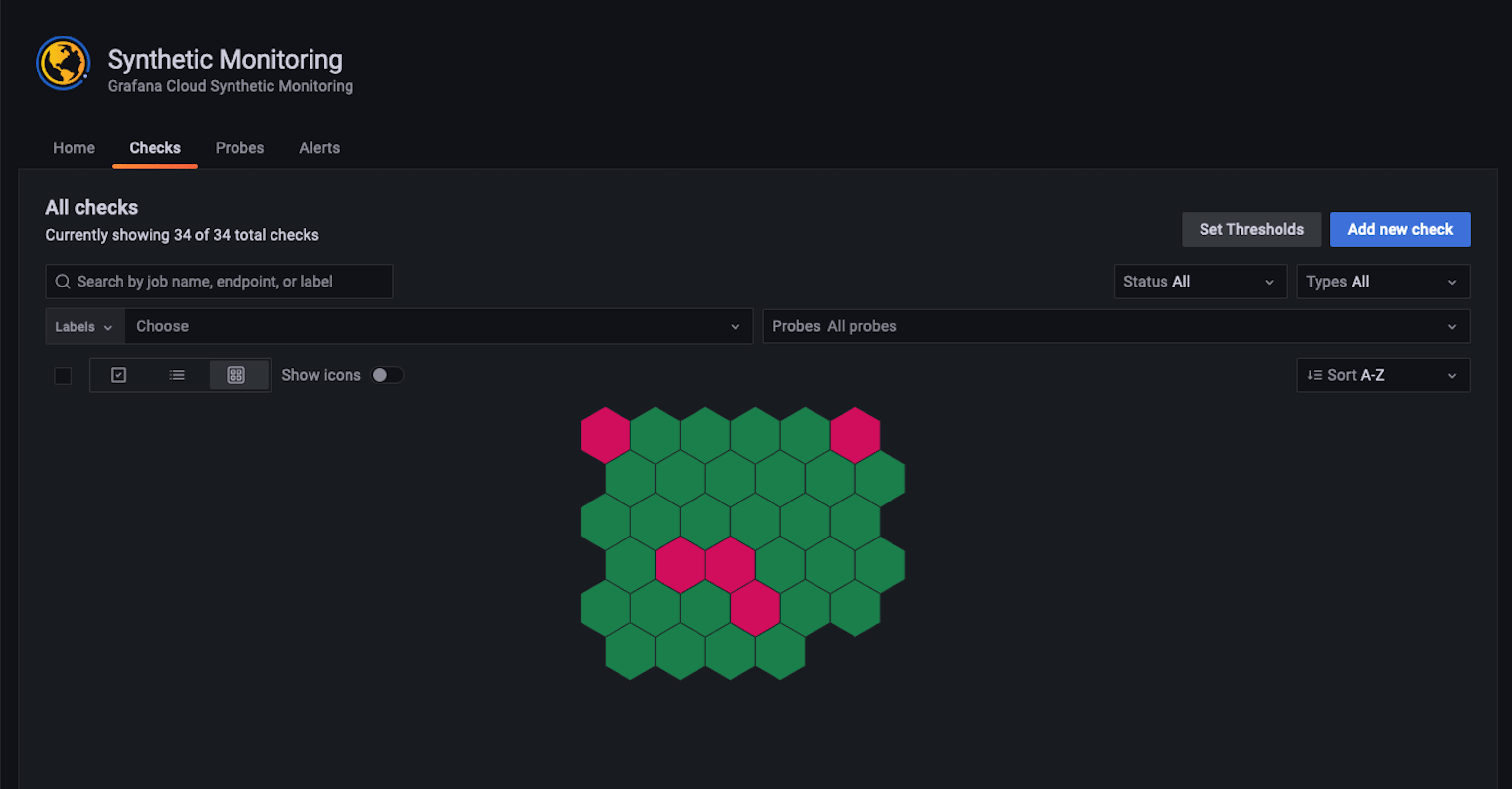 As a result, synthetic monitoring is typically used to simply find out whether a request succeeded or failed, and how long it took. With those two pieces of information, you can visualize an up/down view of your services, as seen in the Synthetic Monitoring plugin in Grafana Cloud: