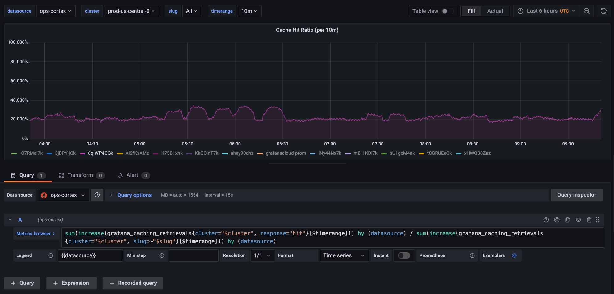 Query caching significantly reduces load times and costs of Grafana dashboards by temporarily storing query results in a cache. Now you can measure the hit rate of your query cache to see how many queries — and therefore how much time and money — it is saving. You can also use these measurements to tune the cache time to live (TTL) to balance performance against viewing up-to-the-second data.