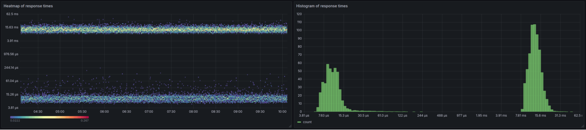 Introduced in Prometheus in 2022, native histograms are a data type intended to eventually replace classic histograms.To illustrate the difference in how they’re visualized in Grafana, the image below shows native histograms in action, with a view of the heatmap and histogram of the response times for a real application.