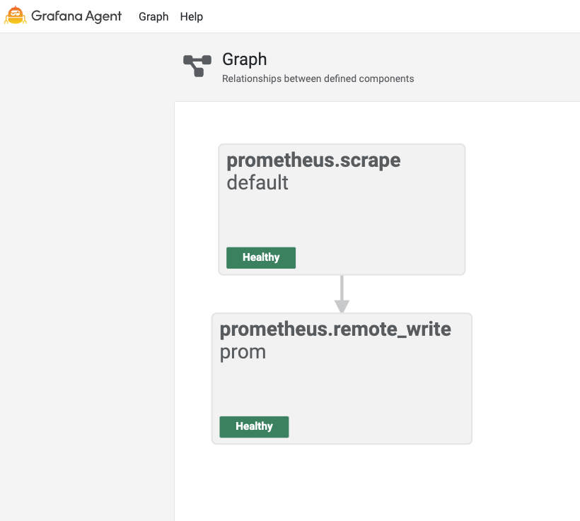 The Agent displays the component pipeline in a dependency graph. See Scraping component and Remote Write component for details about the components used in this configuration. Click the nodes to navigate to the associated component page. There, you can view the state, health information, and, if applicable, the debug information.