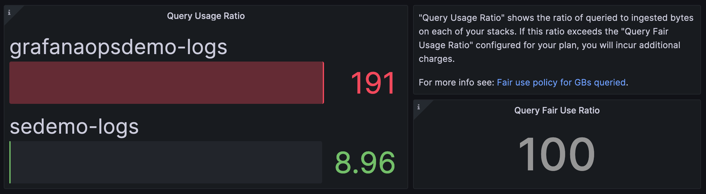 In the image that follows, the grafanaopsdemo-logs stack has a query usage ratio of 191x, which exceeds the fair use ratio of 100x, and would trigger the additional billing considerations noted in the Billing calculations section.