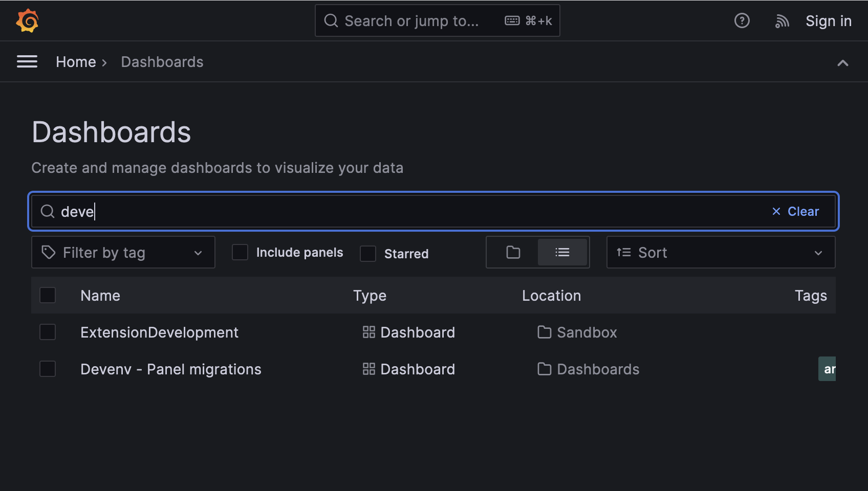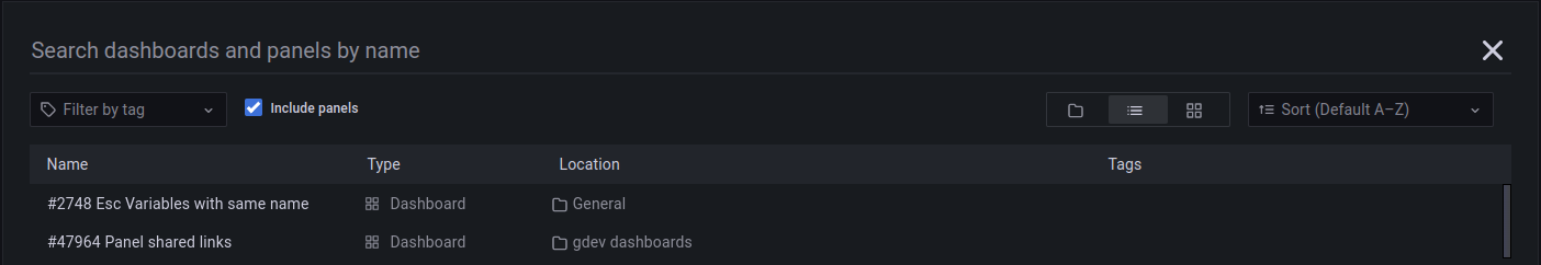 You can search for a dashboard by the title of a panel that appears in a dashboard. If a panel’s title matches your search query, the dashboard appears in the search results.