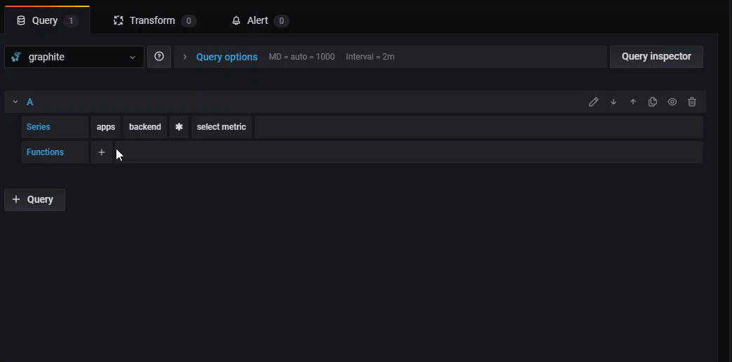 Grafana includes a Graphite-specific query editor to help you build queries. The query editor helps you quickly navigate the metric space, add functions, and change function parameters. It supports a variety of Graphite queries, including complex nested queries, through the use of query references.