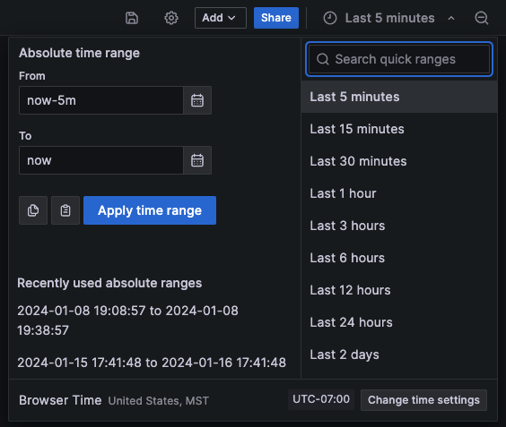 Hover your cursor over the field to see the exact time stamps in the range and their source (such as the local browser).