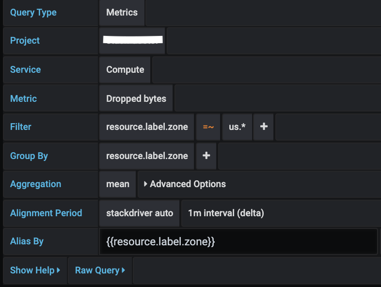 Google Cloud Monitoring metrics can be of different kinds (GAUGE, DELTA, CUMULATIVE) and these kinds have support for different aggregation options (reducers and aligners). The Grafana query editor shows the list of available aggregation methods for a selected metric and sets a default reducer and aligner when you select the metric. Units for the Y-axis are also automatically selected by the query editor.
