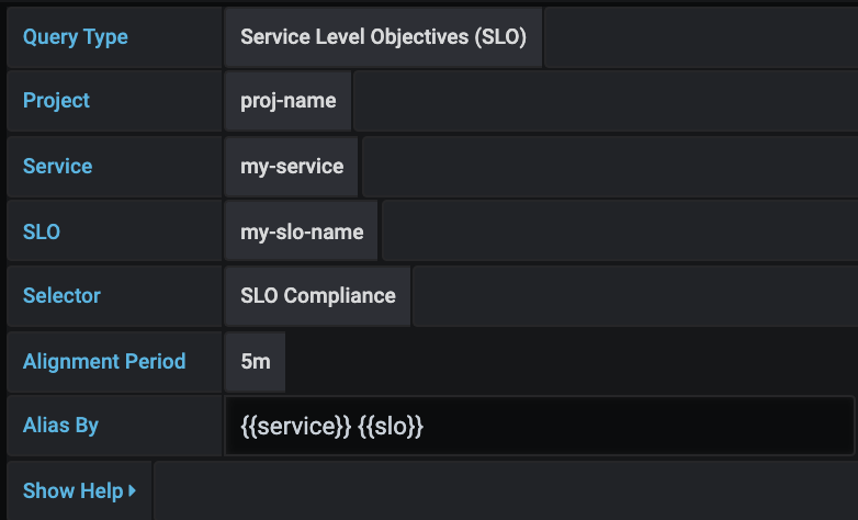 The SLO query builder in the Google Cloud Monitoring data source allows you to display SLO data in time series format. To get an understanding of the basic concepts in service monitoring, please refer to Google Cloud Monitoring’s official docs.
