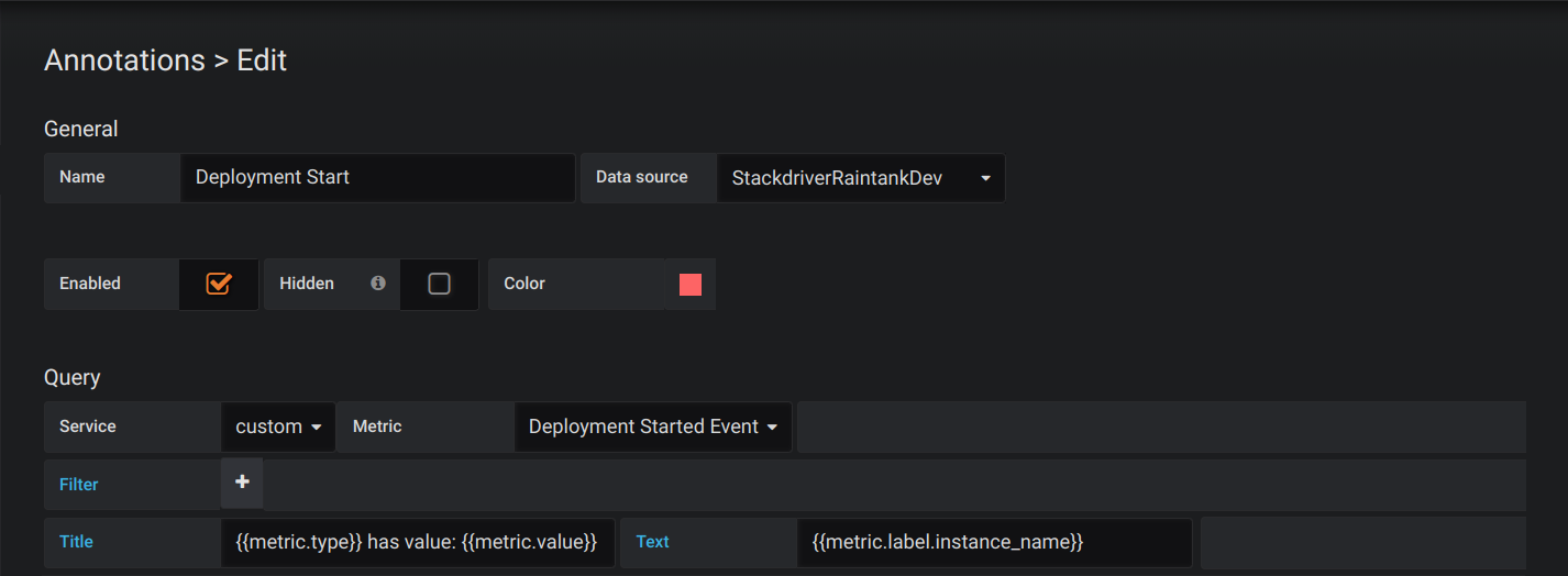 With the query editor for annotations, you can select a metric and filters. The Title and Text fields support templating and can use data returned from the query. For example, the Title field could have the following text: