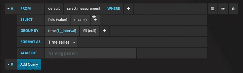 SELECT mean("value") FROM "logins" WHERE "hostname" =~ /^$host$/ AND $timeFilter GROUP BY time($__interval), "hostname"[[varname]] Example: