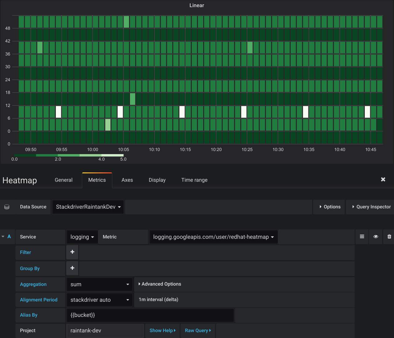 Getting started with the plugin is easy. Simply create a GCE Service account that has access to the Stackdriver API scope, download the Service Account key file from Google and upload it on the Stackdriver data source config page in Grafana and you should have a secure server-to-server authentication setup. Like other core plugins, Stackdriver has built-in support for alerting. It also comes with support for heatmaps and basic variables.
