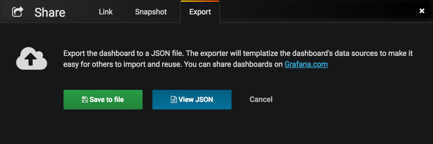 }These inputs and their usage in data source properties are automatically added during export in Grafana 3.1. If you run an older version of Grafana and want to share a dashboard on Grafana.com you need to manually add the inputs and templatize the data source properties like above.