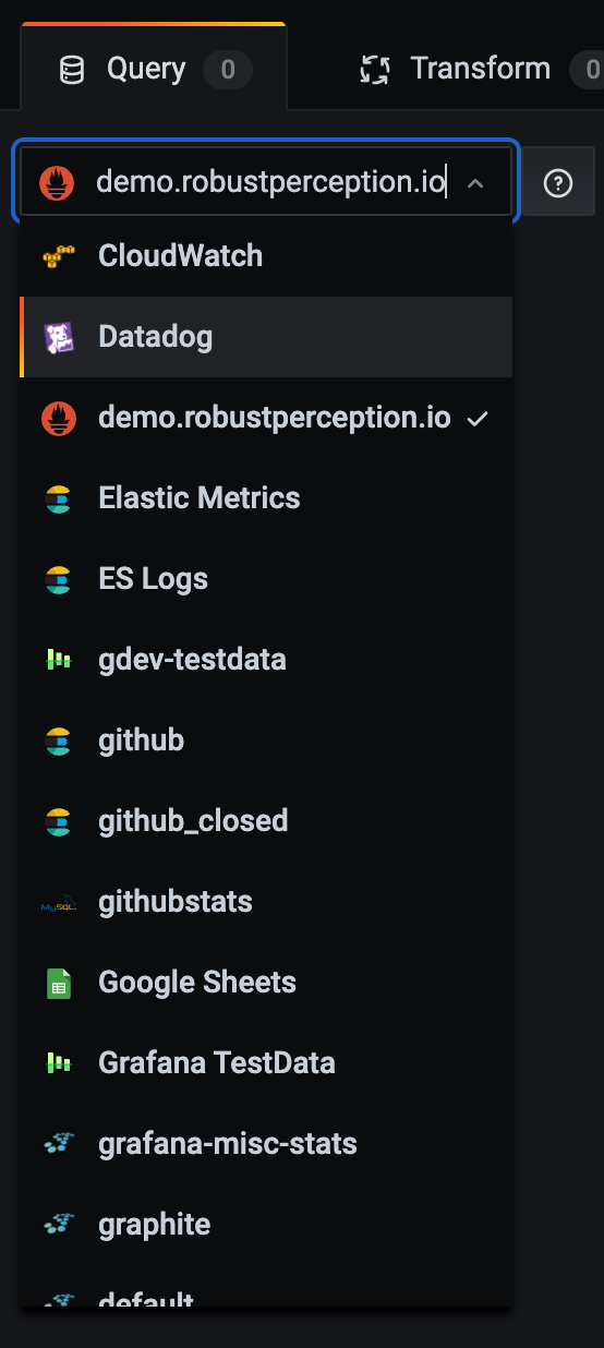 The data source selector is a drop-down list. Click it to select a data source you have added. When you create a panel, Grafana automatically selects your default data source. For more information about adding data sources, refer to Add a data source.