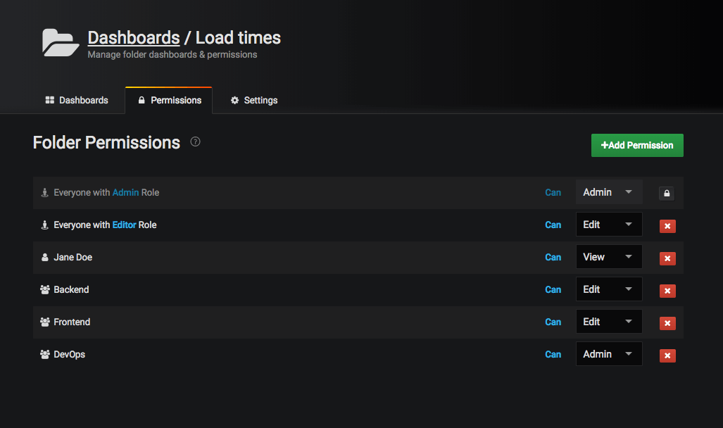 - Admin: Can edit and create dashboards and edit permissions. Can also add, edit, and delete folders.
