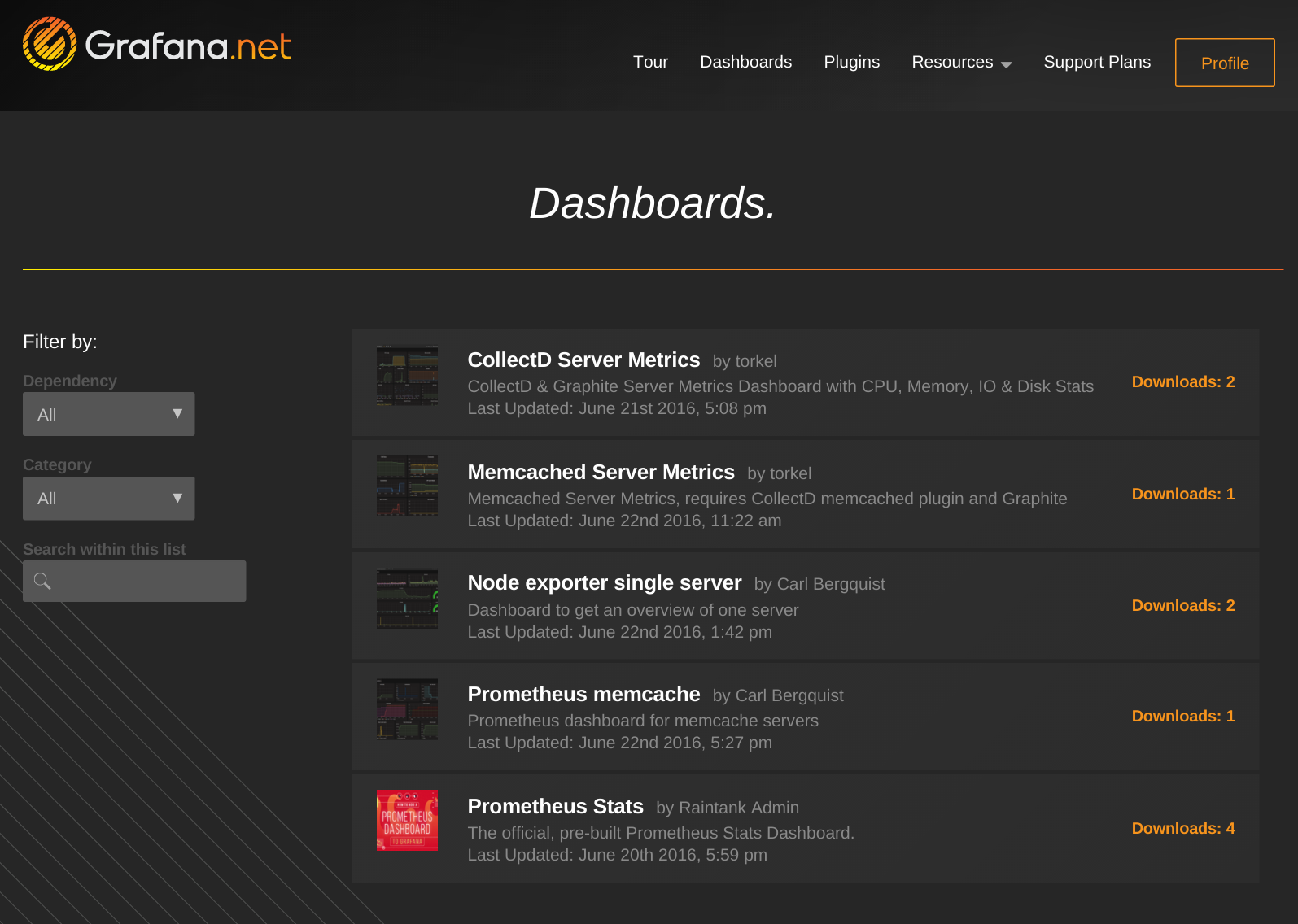 On Grafana.com you can now browse and search for dashboards. We have already added a few but more are being uploaded every day. To import a dashboard just copy the dashboard URL and head back to Grafana, then Dashboard Search -> Import -> Paste Grafana.com Dashboard URL.