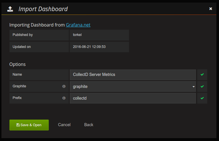 Here you can change the name of the dashboard and also pick what data sources you want the dashboard to use. The above screenshot shows a CollectD dashboard for Graphite that requires a metric prefix be specified.