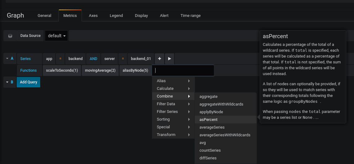 The Graphite query editor has been updated to support the latest Graphite version (v1.2) that adds many new functions and support for querying by tags. You can now also view function documentation right in the query editor!