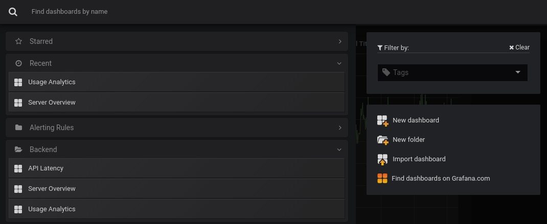 The big new feature that comes with Grafana v5.0 is dashboard folders. Now you can organize your dashboards in folders, which is very useful if you have a lot of dashboards or multiple teams.
