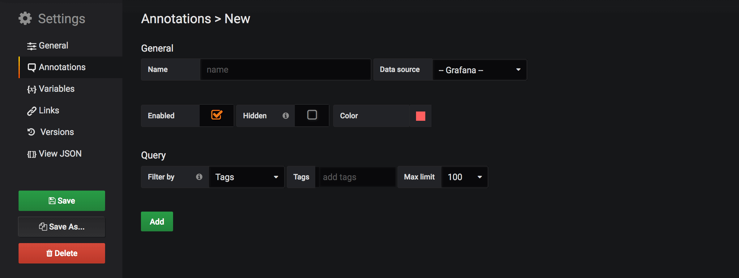 Annotation events are fetched via annotation queries. To add a new annotation query to a dashboard open the dashboard settings menu, then select Annotations. This will open the dashboard annotations settings view. To create a new annotation query hit the New button.