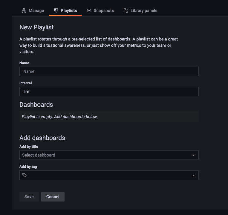 - Update the name and time interval, then add or remove dashboards from the playlist using instructions in Create a playlist.