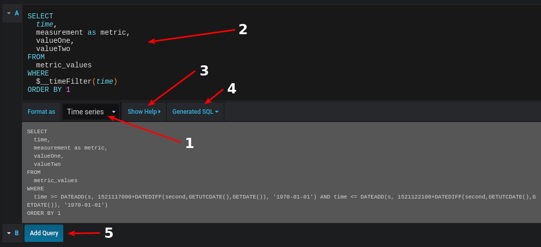 Time series(for use in Graph or Singlestat panel’s among others) orTable(for use in Table panel among others). - This is the actual editor where you write your SQL queries.