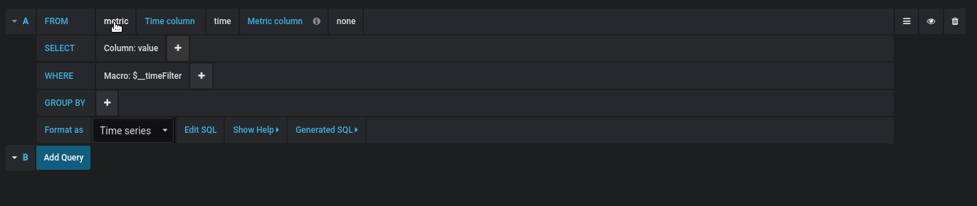 You find the MySQL query editor in the metrics tab in a panel’s edit mode. You enter edit mode by clicking the panel title, then edit.