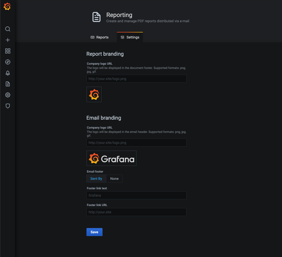 - Company logo URL - Company logo displayed in the report PDF. Defaults to the Grafana logo.