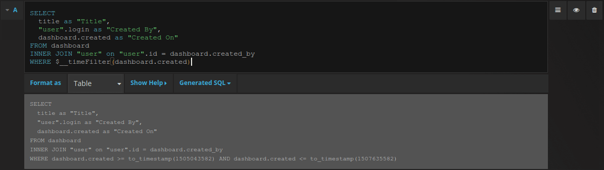 $__time(dateColumn)Will be replaced by an expression to convert to a UNIX timestamp and rename the column to time_sec. For example, UNIX_TIMESTAMP(dateColumn) as time_sec
