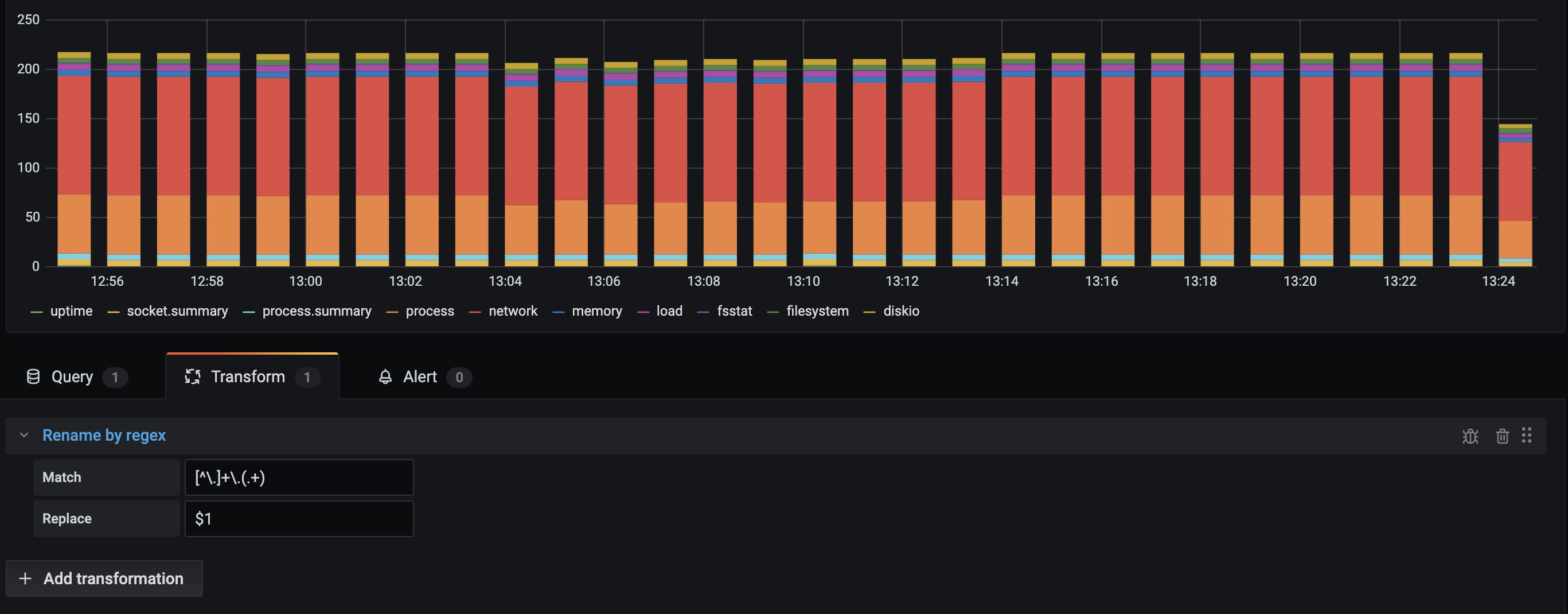 You can specify a regular expression, which is only applied to matches, along with a replacement pattern that support back references. For example, let’s imagine you’re visualizing CPU usage per host and you want to remove the domain name. You could set the regex to ([^\.]+)\..+ and the replacement pattern to $1, web-01.example.com would become web-01.